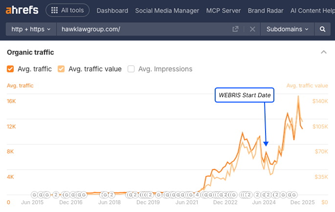WEBRIS executed a full-scale SEO overhaul for Hawk Law Group—including technical fixes, local optimization, content expansion, and authoritative link building—to rebuild their organic visibility across the CSRA. The result was stronger rankings, more traffic, and a significant increase in inbound personal injury leads across all office locations.