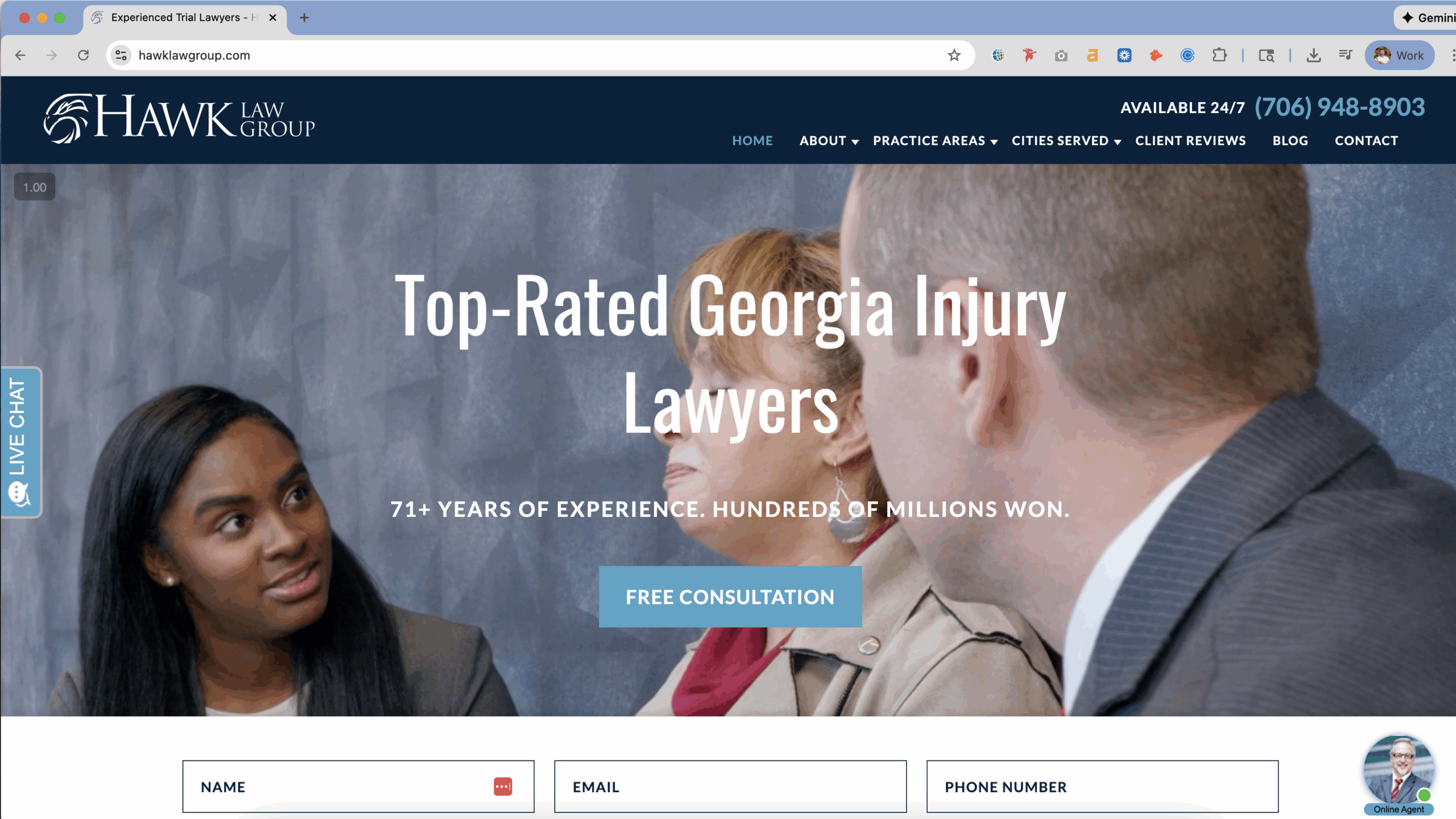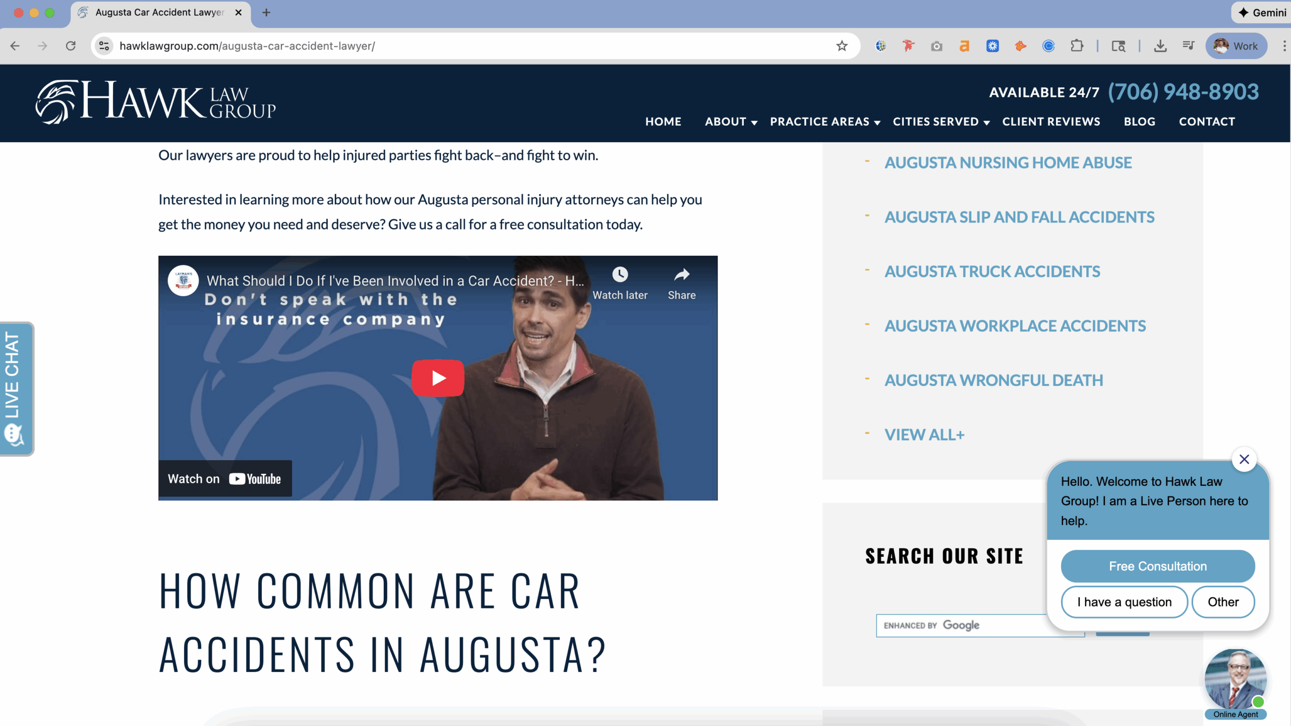 Because Hawk Law Group serves multiple Georgia and South Carolina cities, we rebuilt their entire local presence: